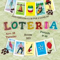 - Mark your calendars. Chicano Club will host a Lotería event on Tuesday, November 18 in room 323 during periods 9 and 10. Stop by for free snacks, drinks, and a chance to win prizes!